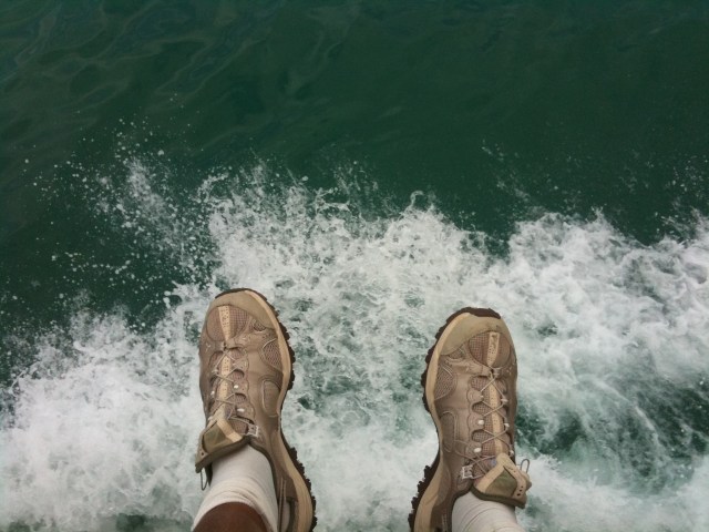 I cling to the railing t my right with legs, arms, feet and hands; and the teenage boys behind me with no shirts on slip around and laugh hysterically. Main difference between youth and middle age – I now believe I am going to die, so can’t enjoy moments like that as much. Still, when the waters calm down it is a beautiful vantage point.