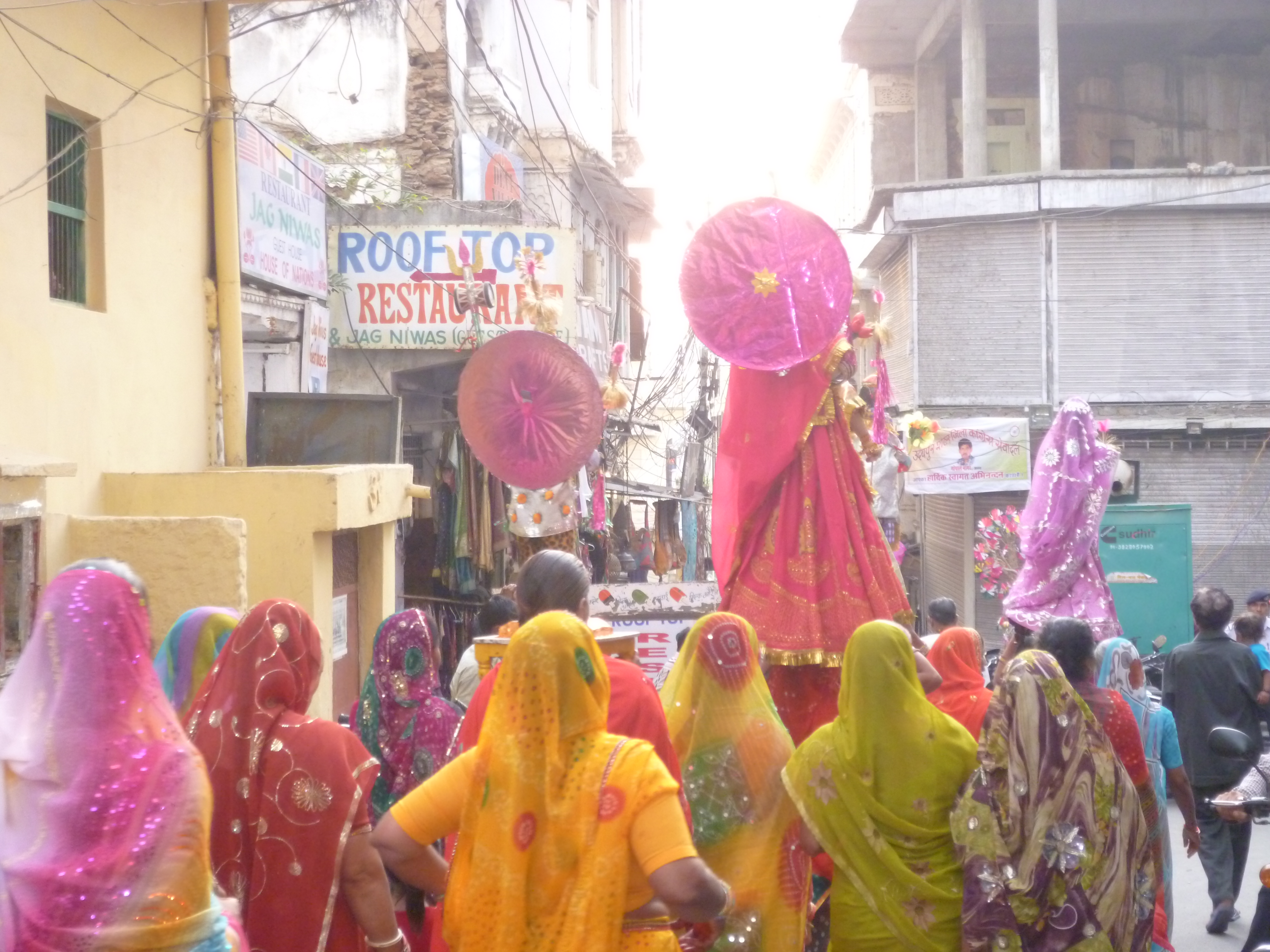 Mewar is a spring festival centered around girls and women. Every night for three nights in a row, all the ladies and girls in town get dressed up in their best and join a procession down to the lake ghat (steps) to honor the Gods and pray for good marriages and fertility.