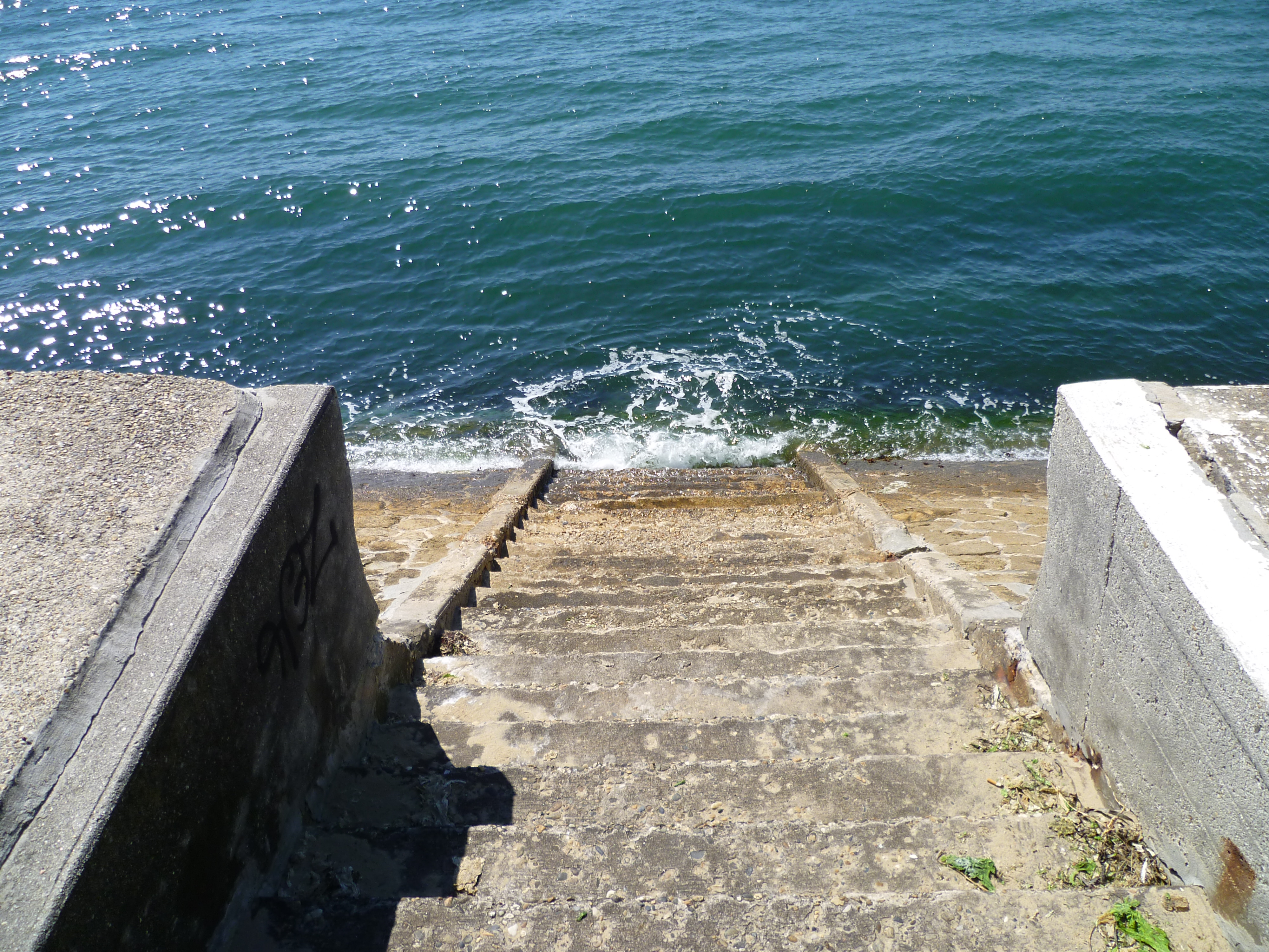Then I go to the other beach.  It’s only a beach in a loose sense of that word. It’s really just a concrete slab. But there are some stone steps leading straight down into the water. And the water is beautiful.