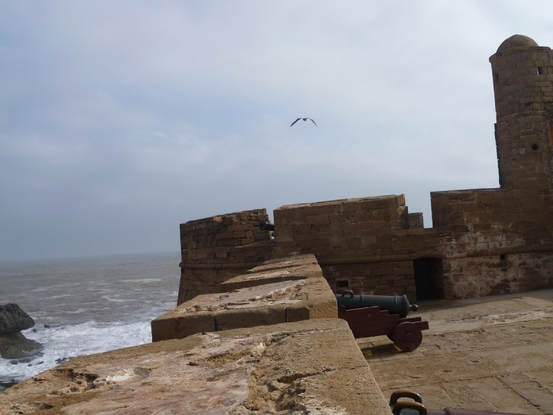 Next I took the train to Essaouira, an old fort beach town on the Atlantic coast.  I expected desert on the way. The land outside the train windows was indeed flat and brown, but in tidy squares rimmed with edges of green; olives, shrubs, brush.  Essaouira itself was very India like, two story dilapidated stone and concrete buildings, dirty over flowing sewers.