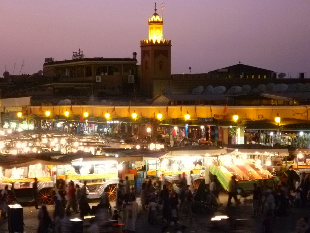 Crowds form circles around each performer and then a hard press of sweaty bodies fills in all the white spaces between the circles.  From above the mass of thousands of people, you feel more than hear the faint drum beat.  As you descend into it, each circle pulls you closer with its centrifugal force until you enter its particular field of sound and light, transported into whatever world the performer is creating inside the warm human circle of his crowd.  Then you move on to the next and the next and its infinite, all walks of life out at nigth.   No one here feels local, even the Moroccans; everyone is out for a good time.  The square is crowded with all types; teens, eldery, family. It’s like a summer night out in New York City’s Times Square, where it seems the whole city has poured itself out onto the streets. Although the mosque towers above us in the distance like a snowcapped mountain, the feeling is anything but devout.