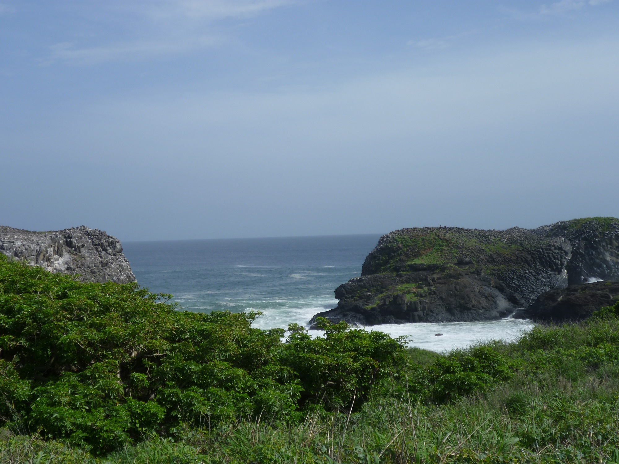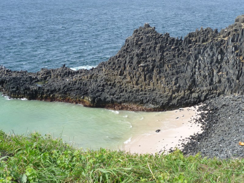 The cove was beautiful. The island curved in on itself like a figure eight, and through a narrow opening sat our rocky beach. On either side of the beach were the low cliffs of the island. At one end was the opening we came through and at the other end was a short wall of rocks that open sea waves gently swelled over as well. In the background was another depression, and every once in a while whitewater would splash up out of it as well. The beach was all smooth black volcanic rock of various sizes, crustacean shells and coral. It was one of the most beautiful beaches I had ever seen, and I had been to a lot of nice beaches on this trip. In the center of this wonderful rock formation was a deep natural pool, perfect for swimming.